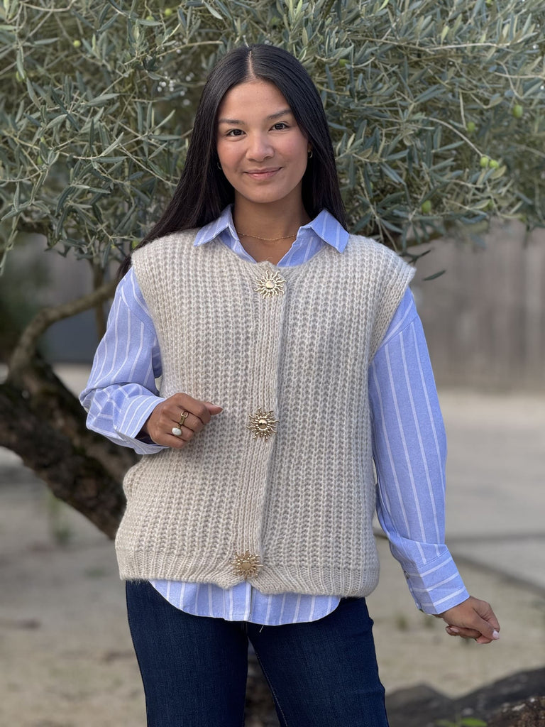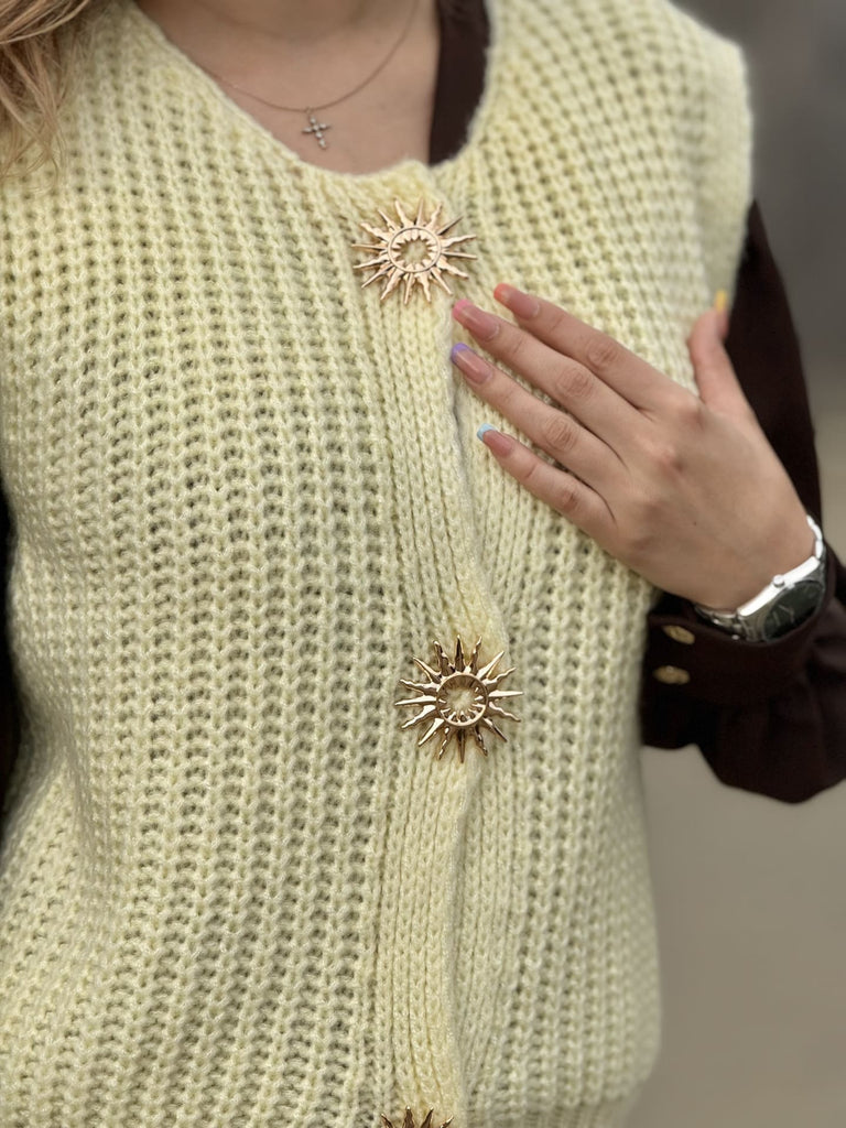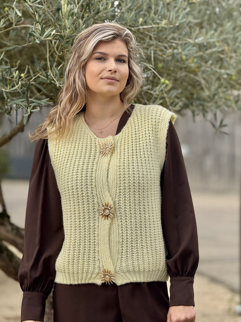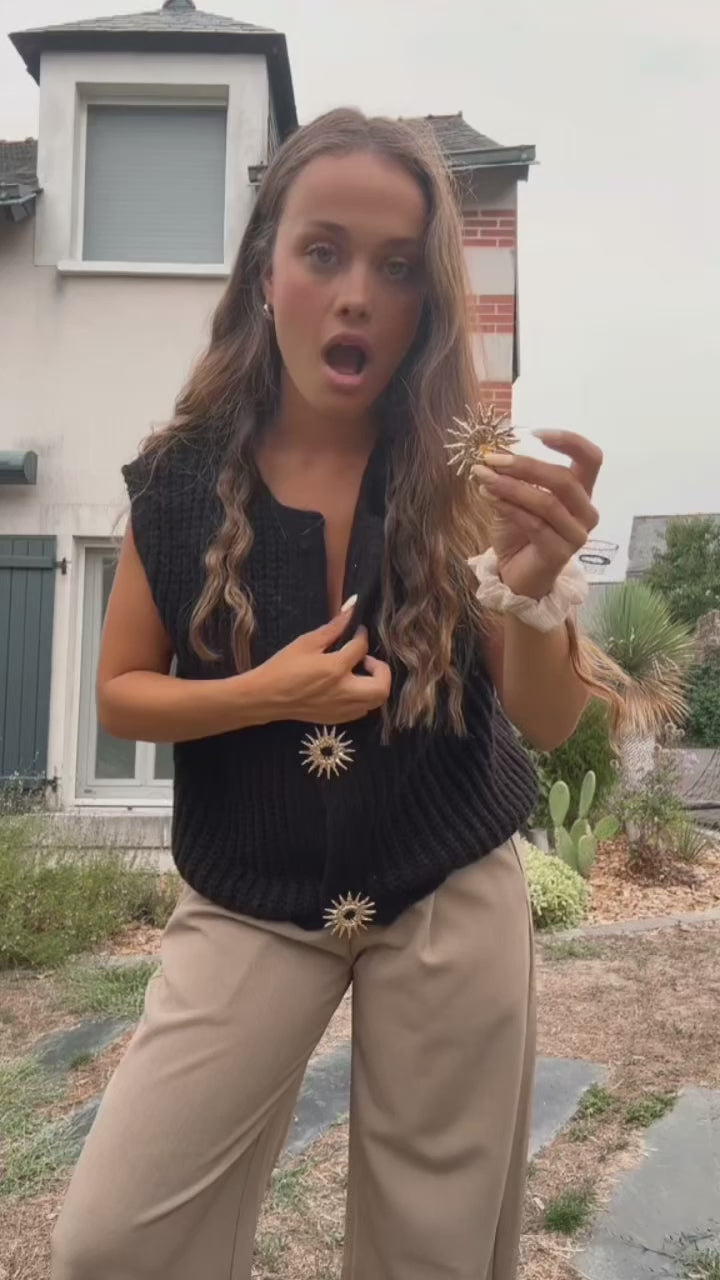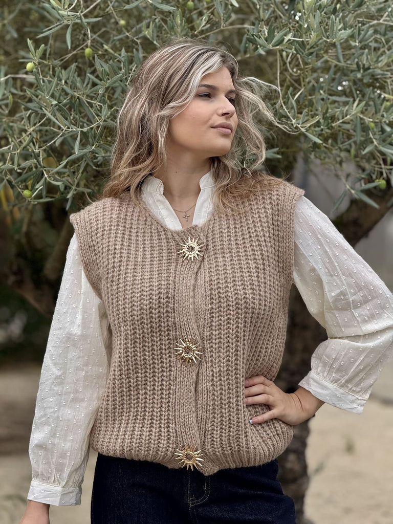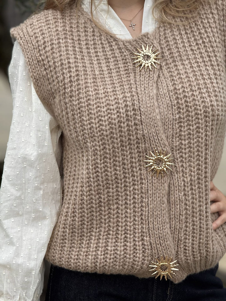 - GILET SANS MANCHE COL ROND AVEC BOUTONS BROCHE SOLEIL DORE