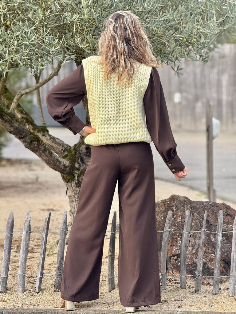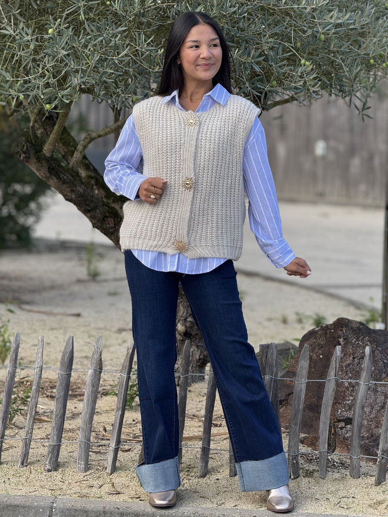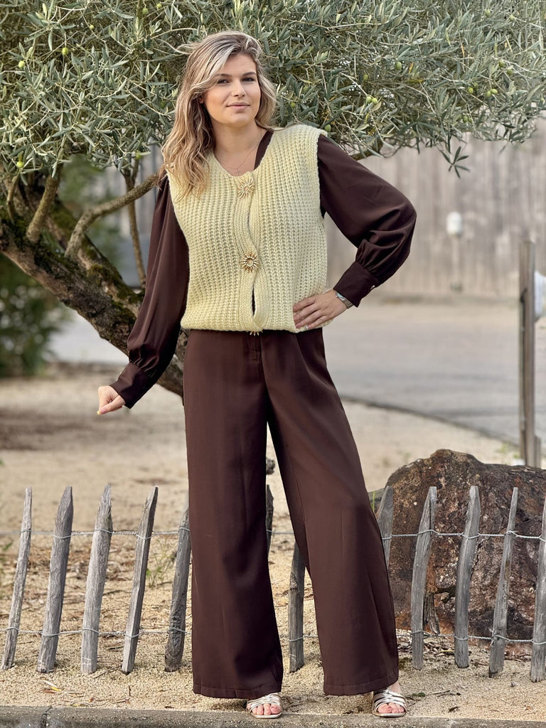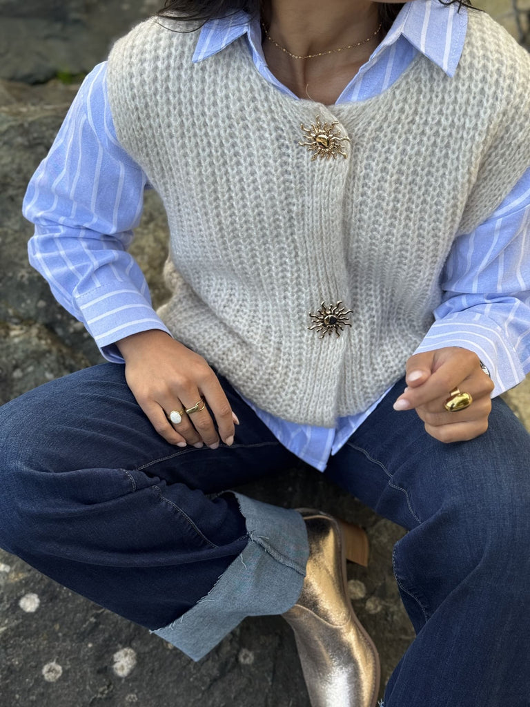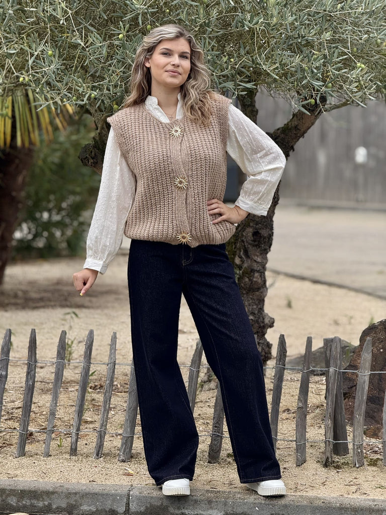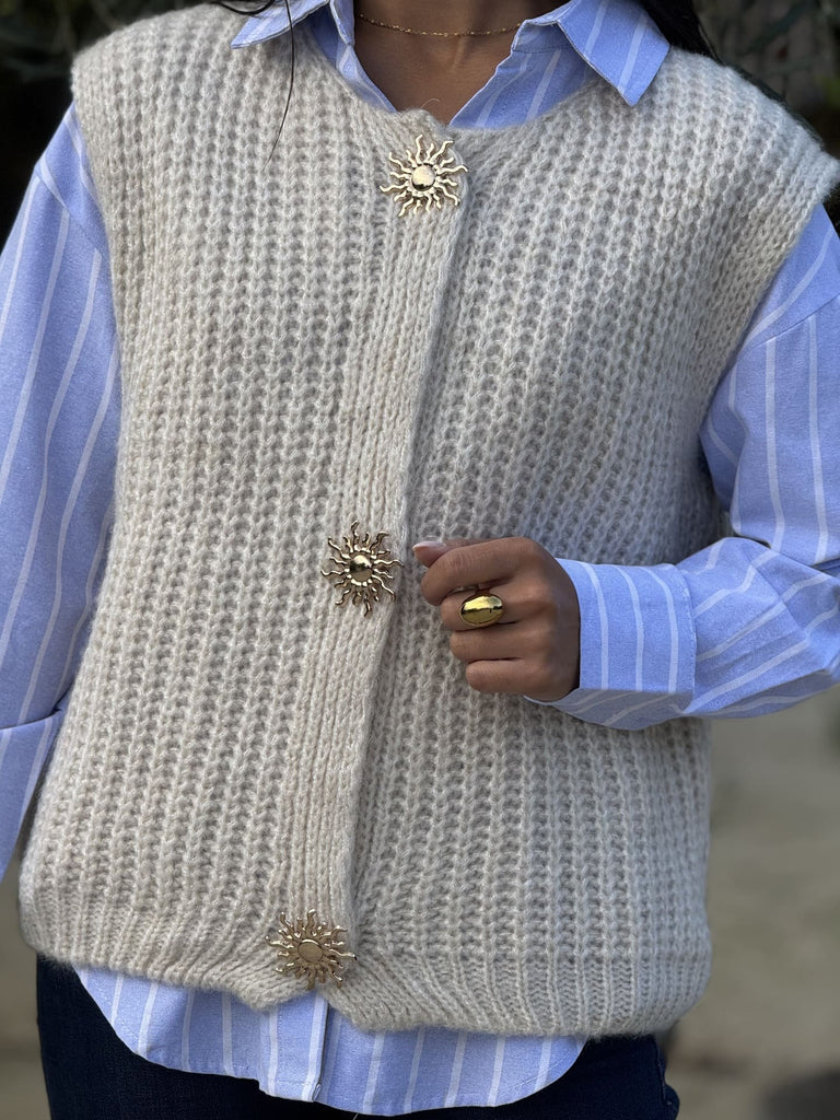 - GILET SANS MANCHE COL ROND AVEC BOUTONS BROCHE SOLEIL DORE