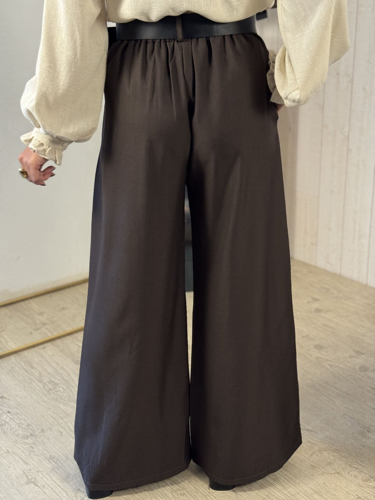 - Wide-legged pants with high waist, front pocket and black belt