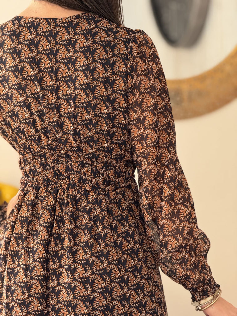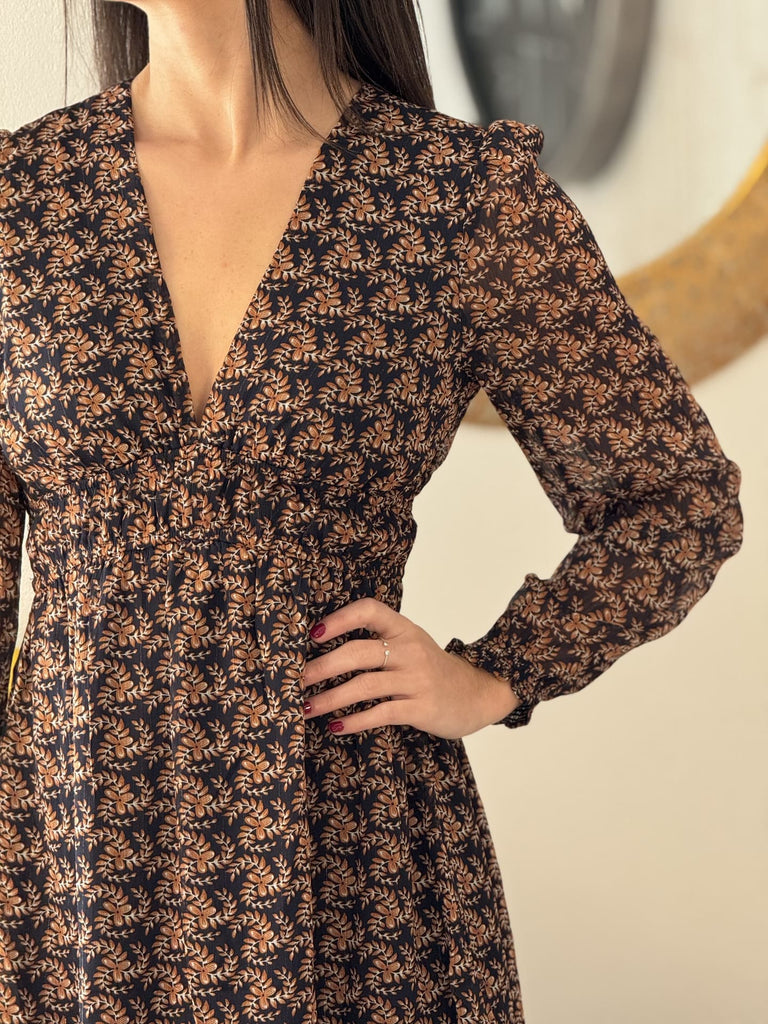 • Robe courte à ml col v plongeant - imprimé feuilles camel