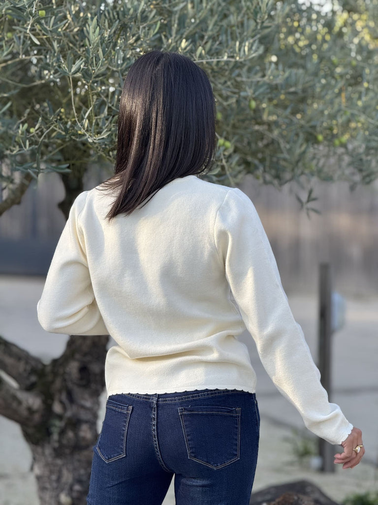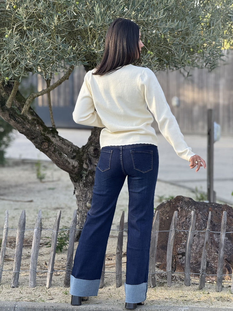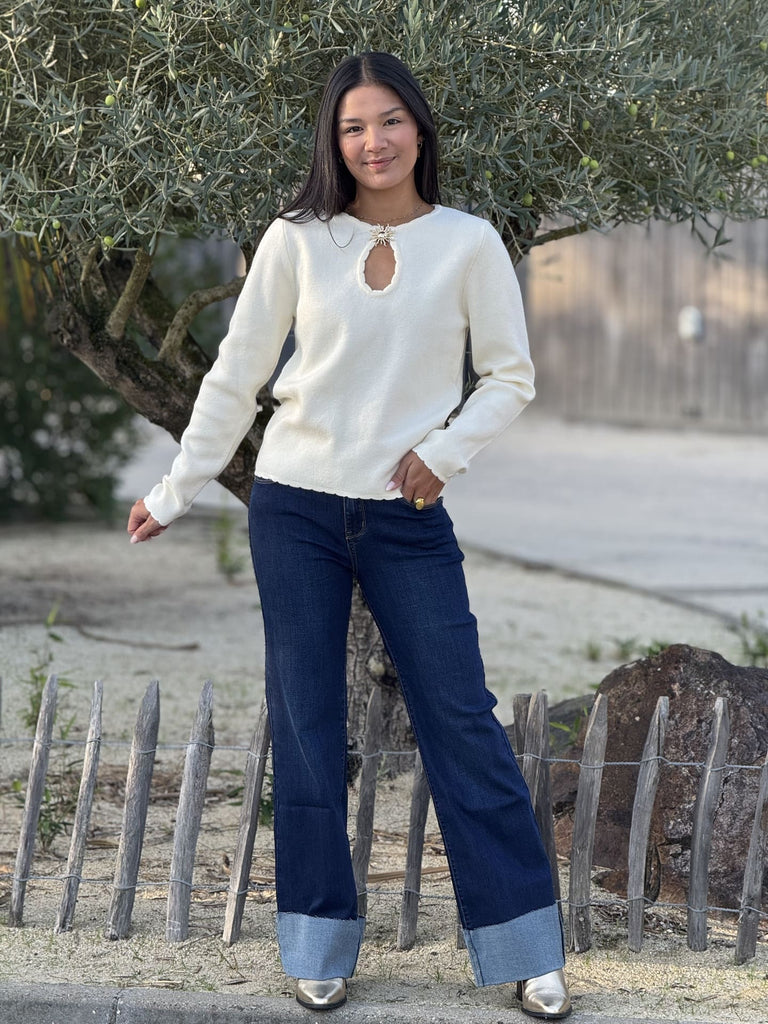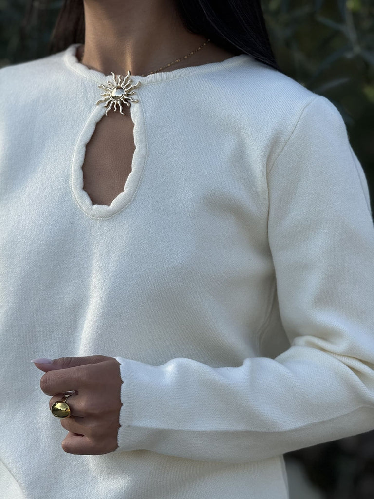 - Pull à ml col rond avec trou au decolleté et broche soleil