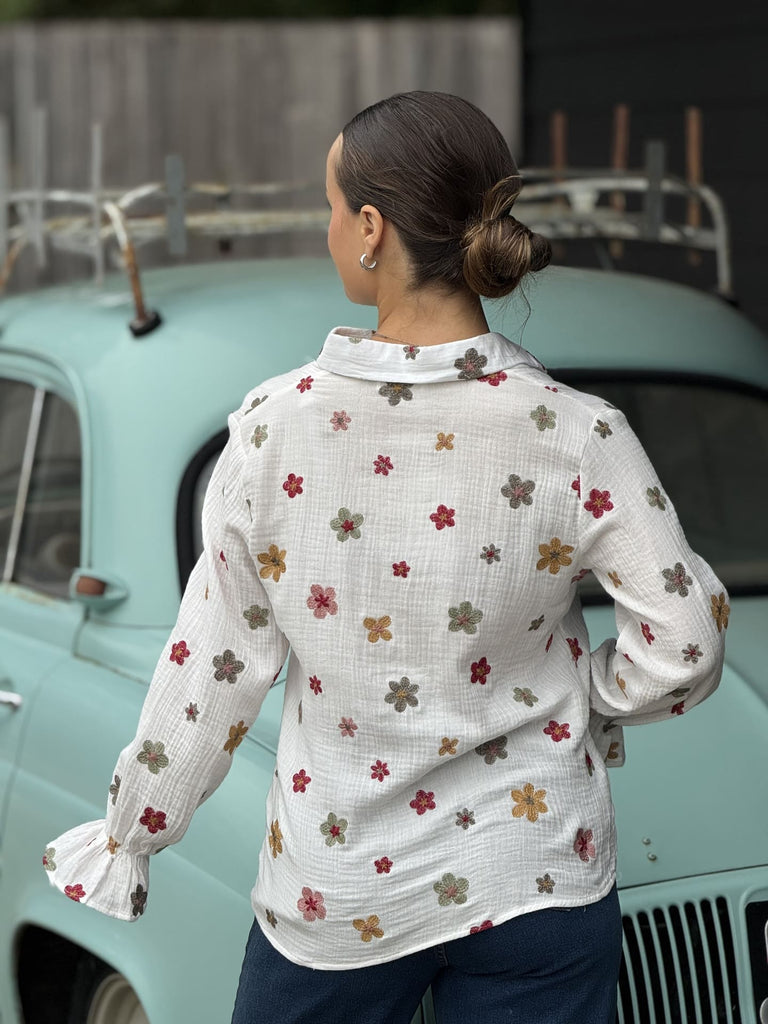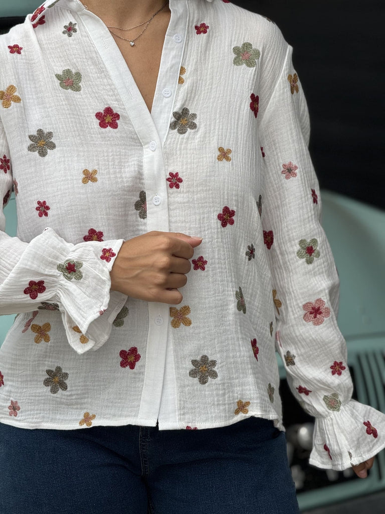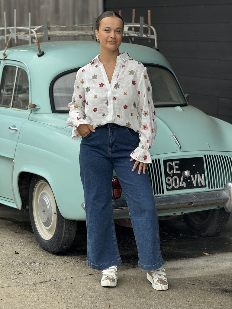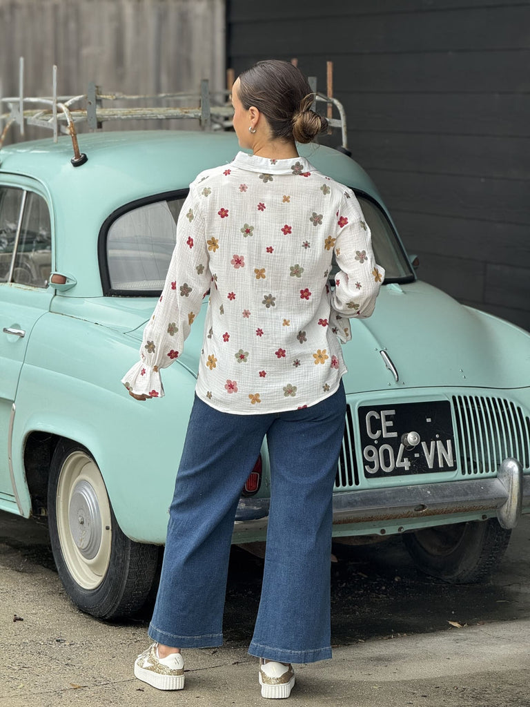 - Chemisier blanc à ml avec imprimé fleurs rouge vert orange en gaze de coton