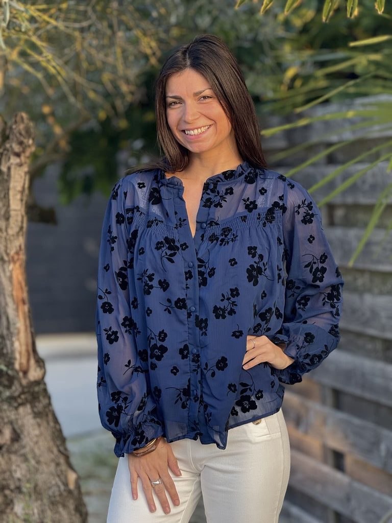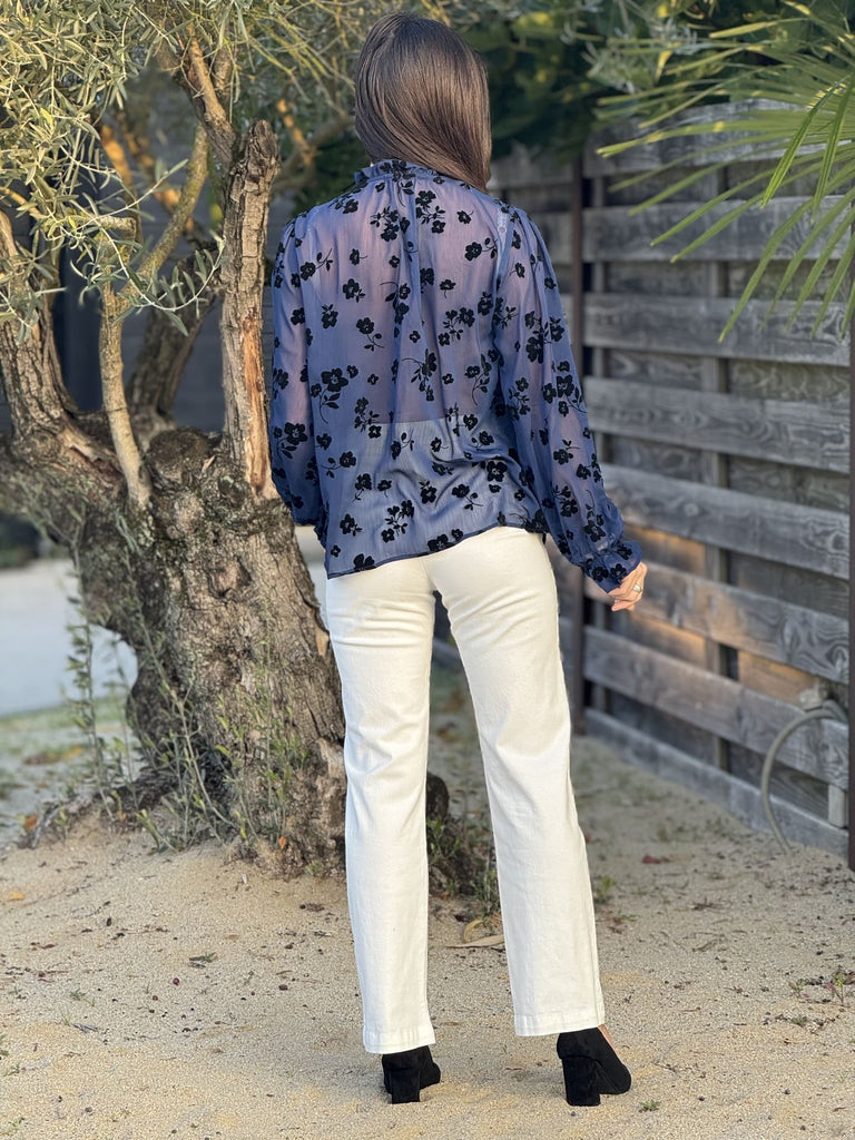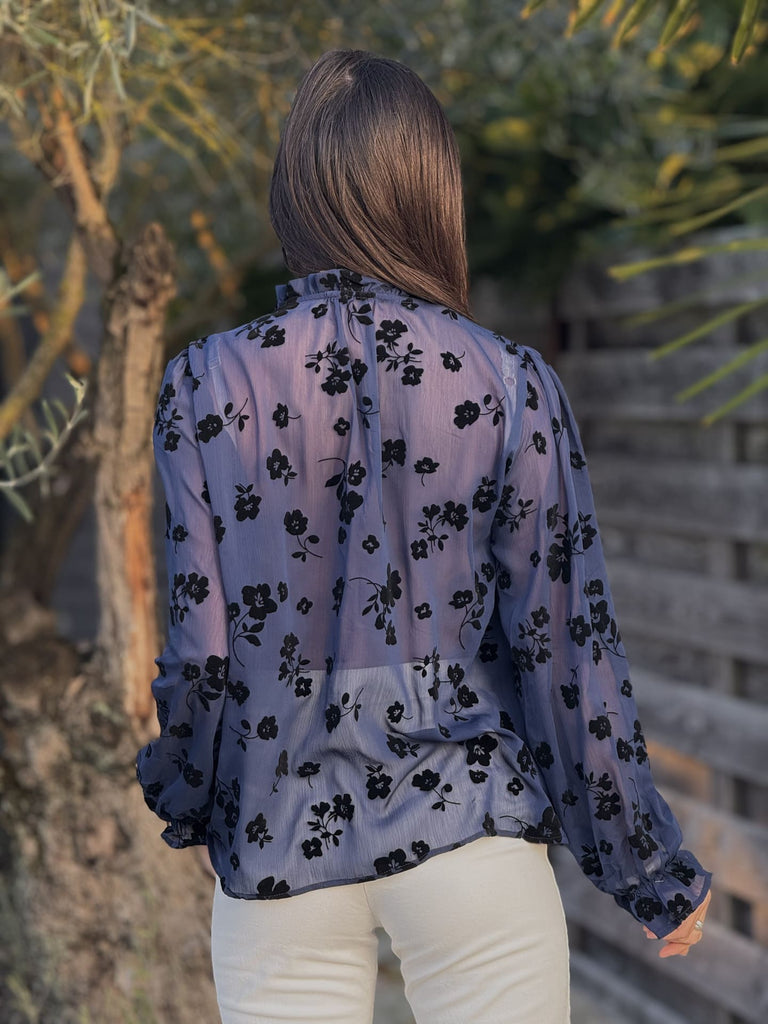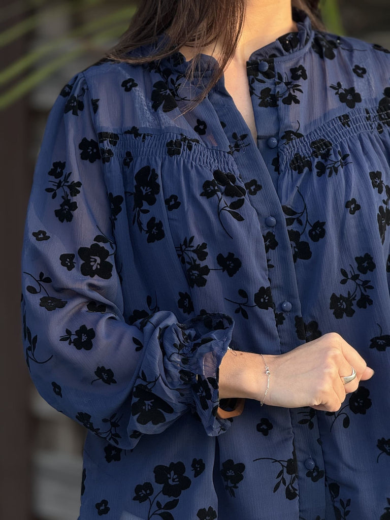 - Chemisier à ml col haut froufrou - imprimé fleurs en relief