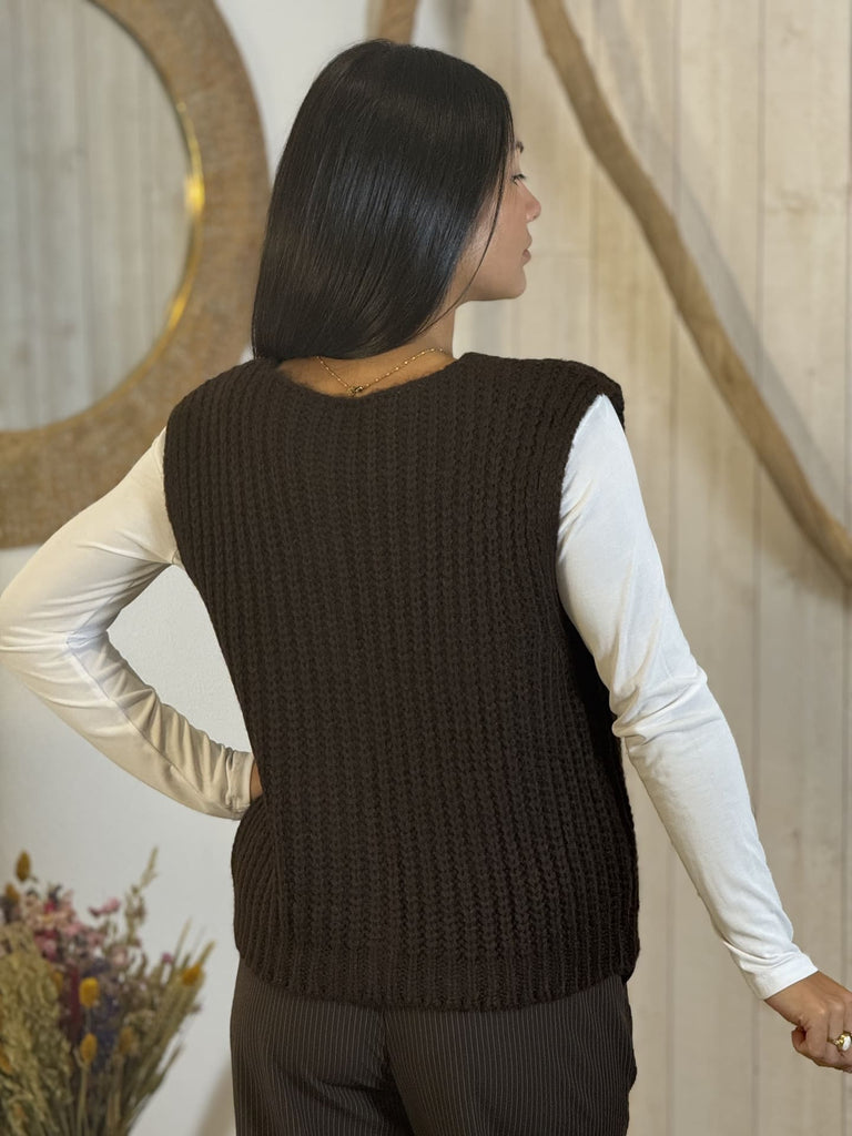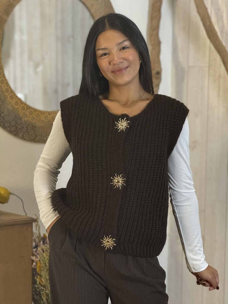 • GILET SANS MANCHE COL ROND AVEC BOUTONS BROCHE SOLEIL DORE