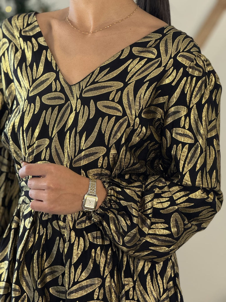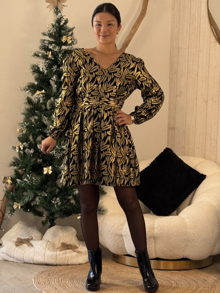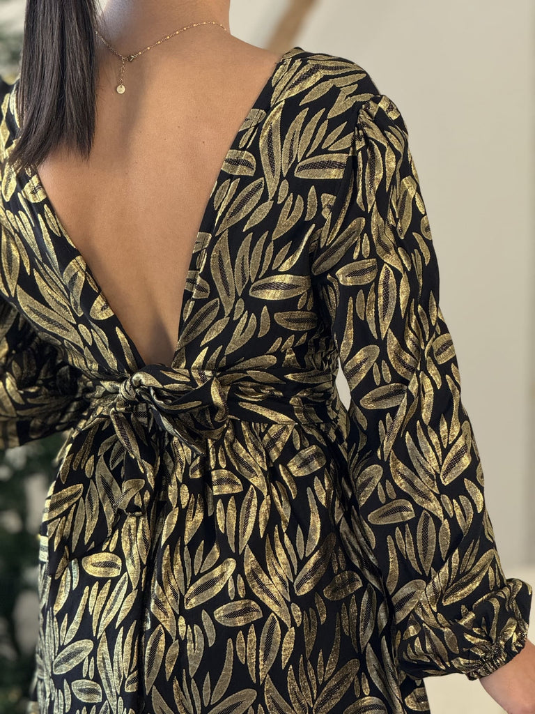 • ROBE COURTE à ml dos ouvert en v avec nœud - imprimé feuilles doré
