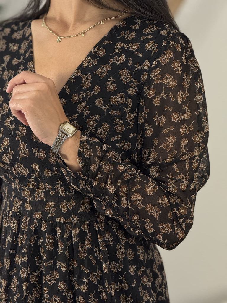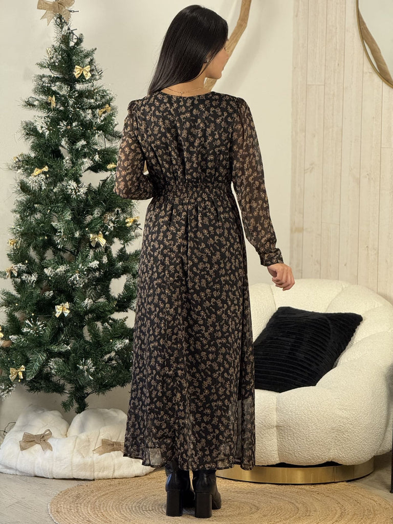 • Robe longue ml col v cache cœur imprimer fleurs marrons