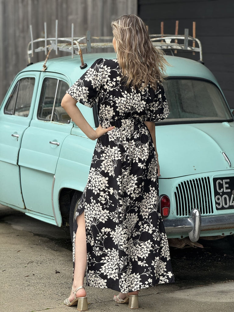 • ROBE LONGUE à mc col v - imprimé feuilles bleu