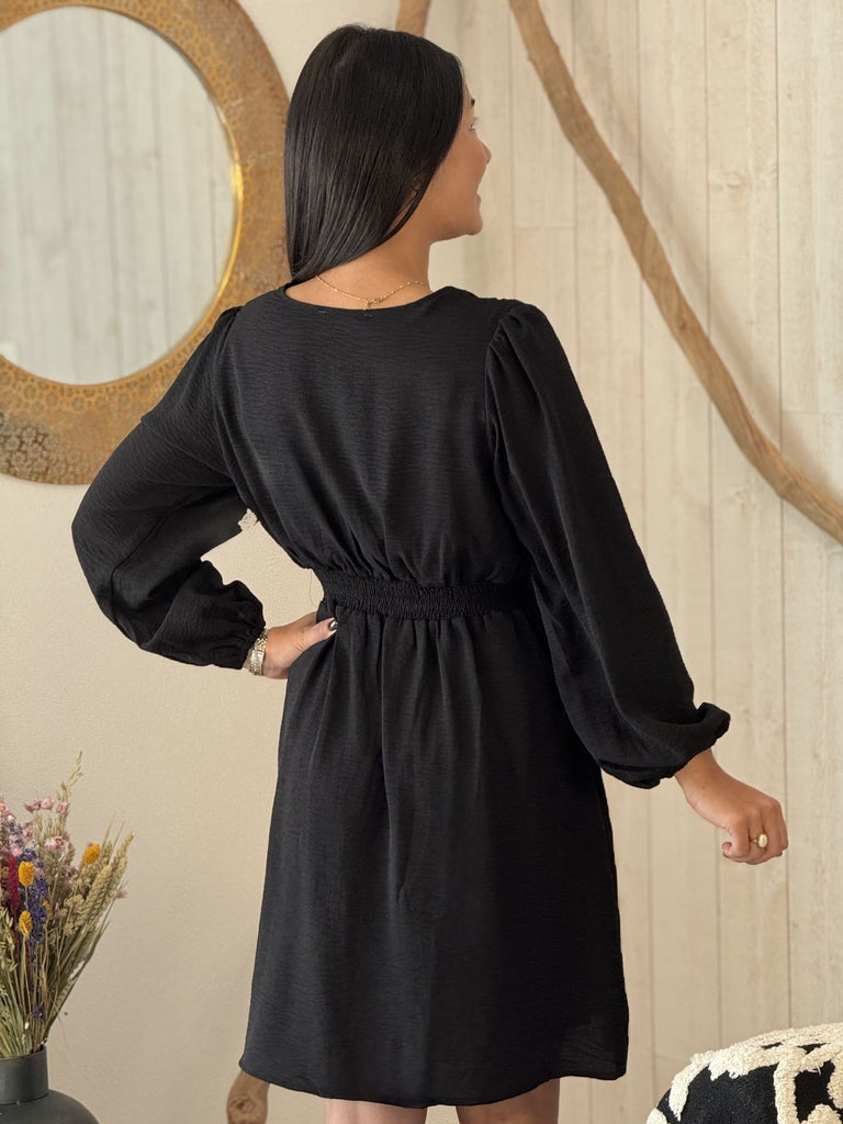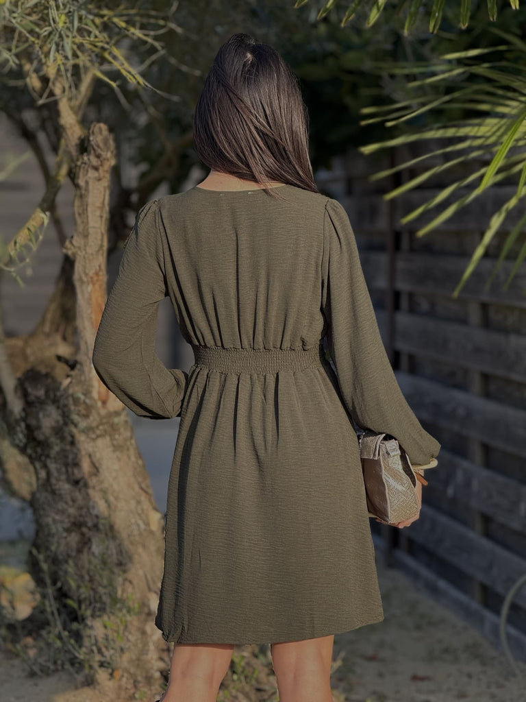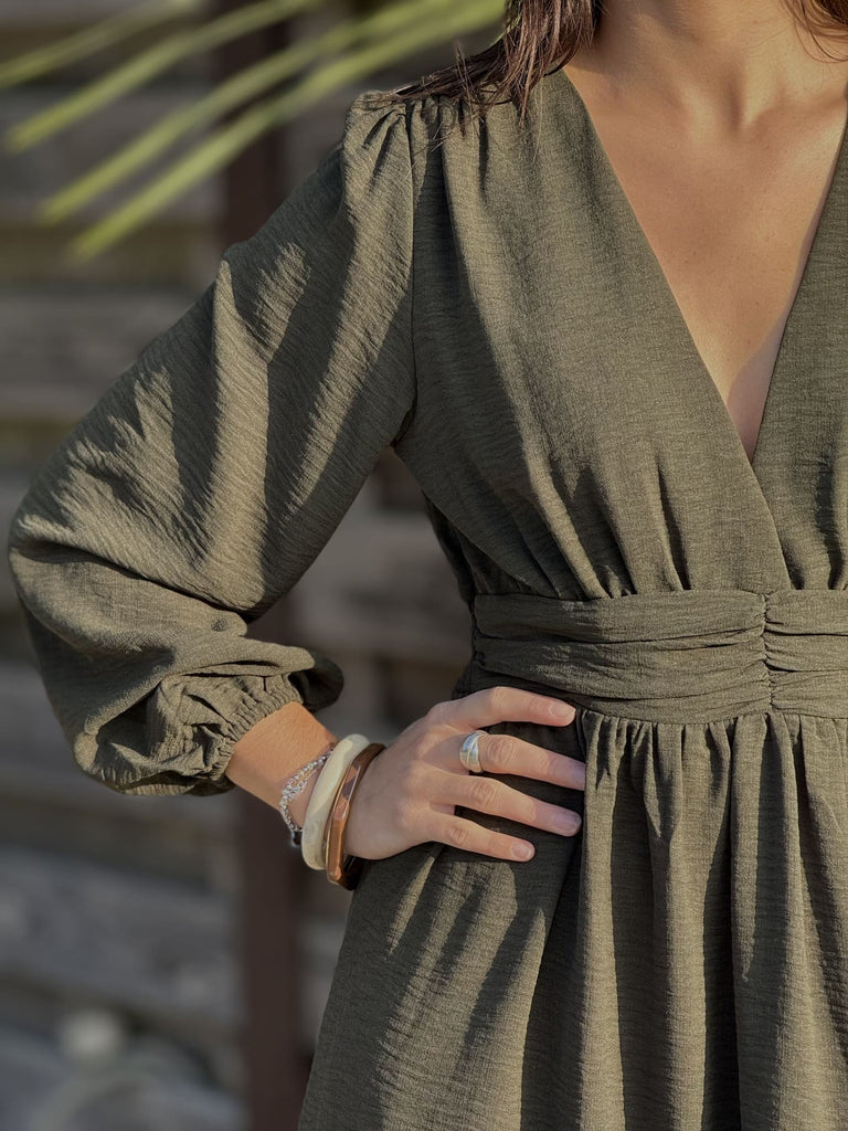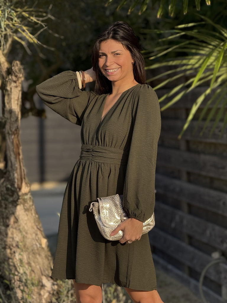 - ROBE COURTE à ml - col v plongeant - resserré à la taille - unie
