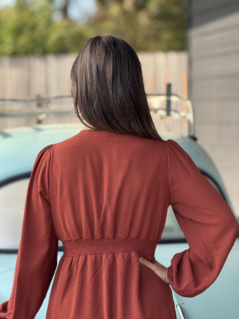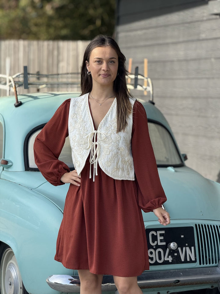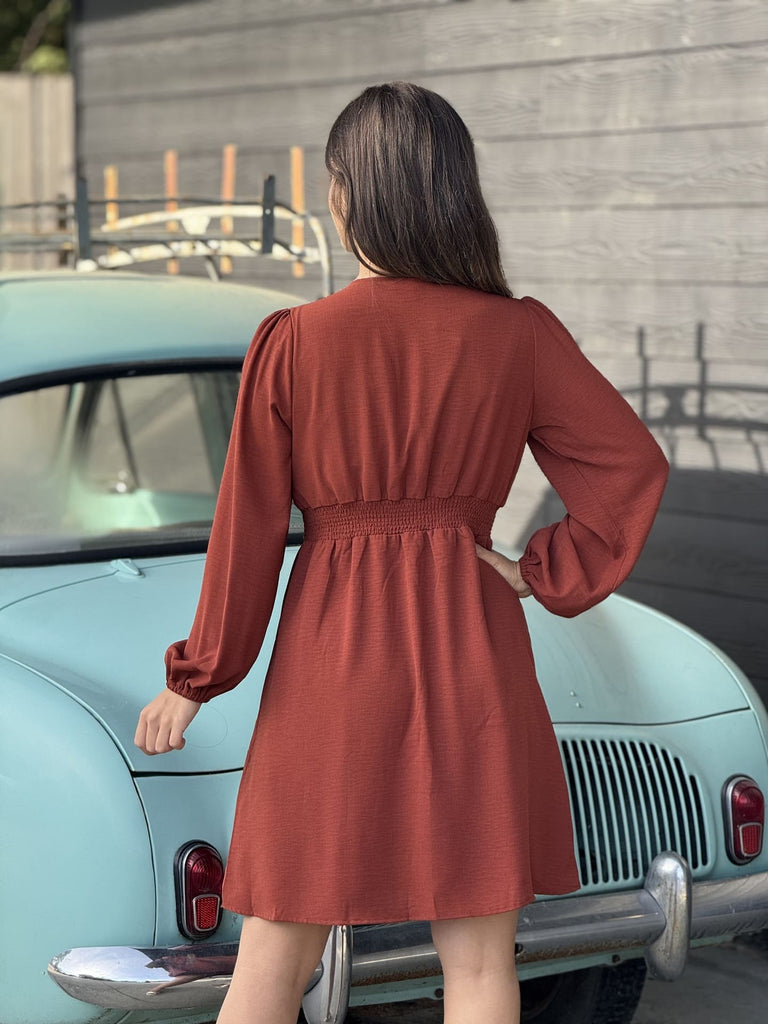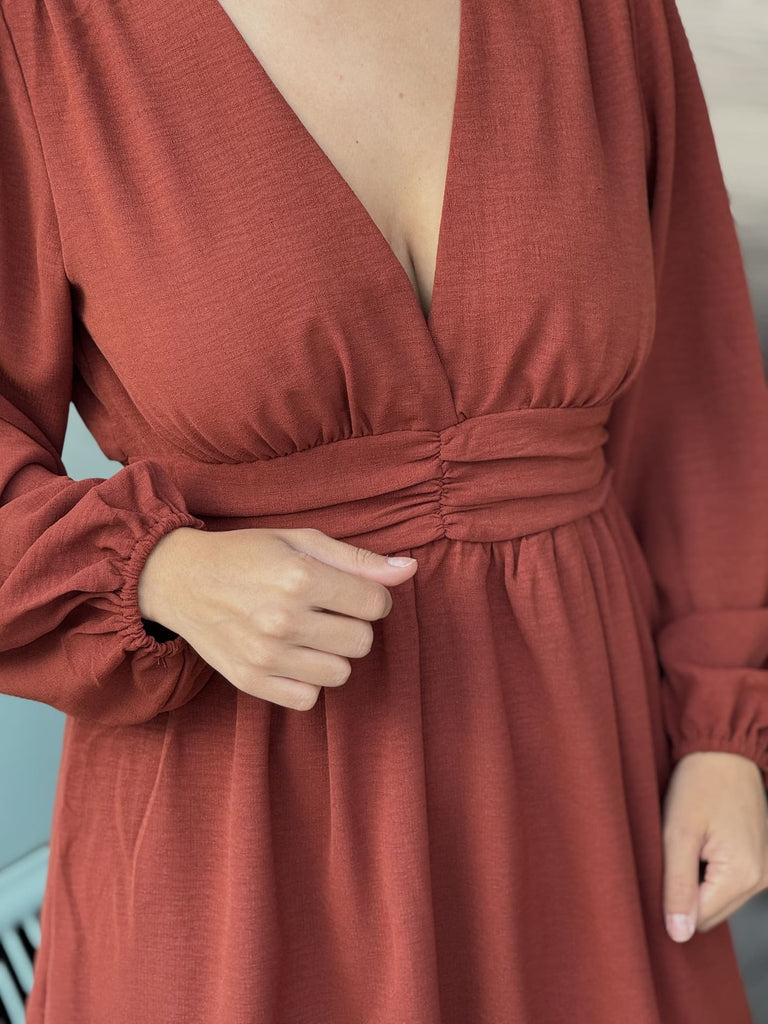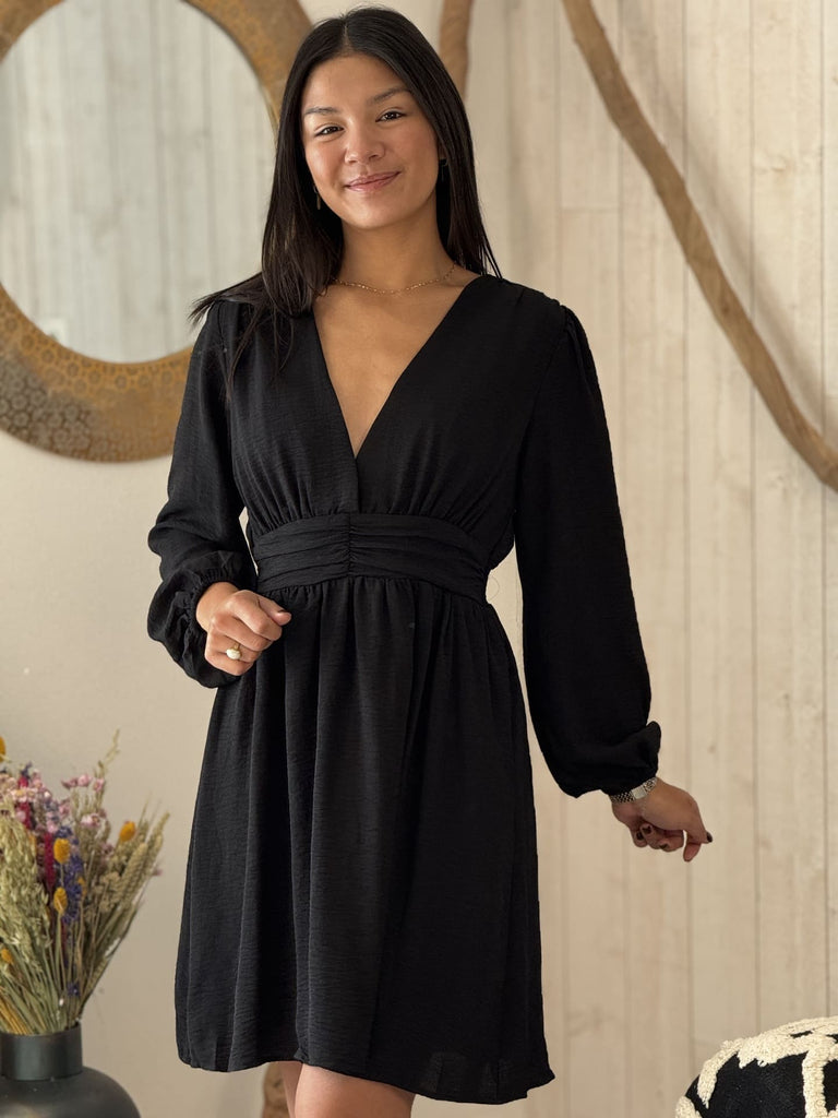 - ROBE COURTE à ml - col v plongeant - resserré à la taille - unie