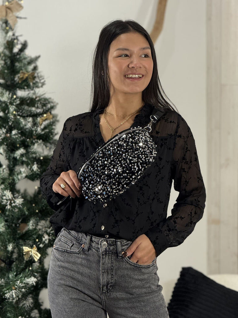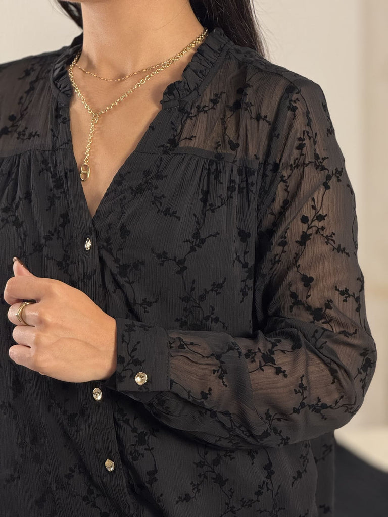 • Chemisier à ml col v - MOTIF VELOURS FLEURS -  5 BOUTONS DOREES