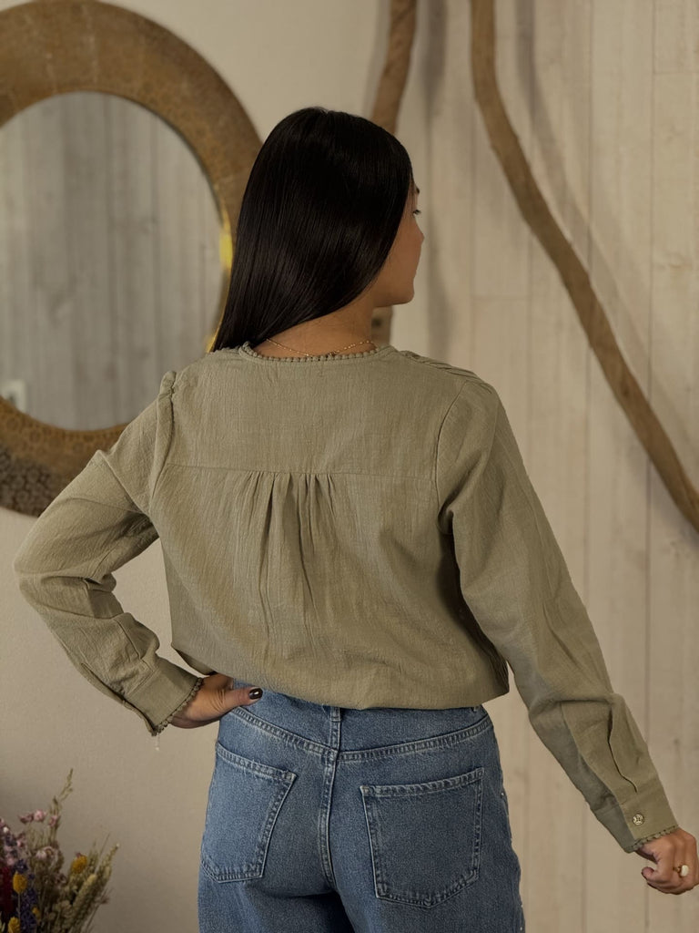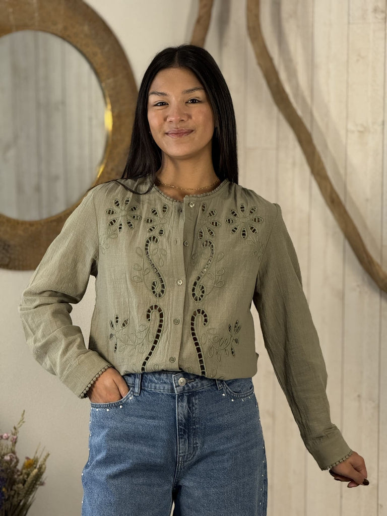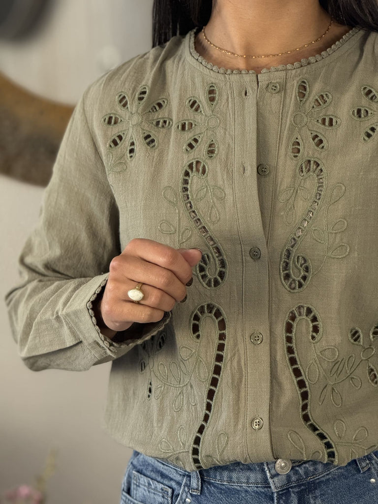 • Chemisier col rond broderie fleurie à l'avant et au col et aux manches