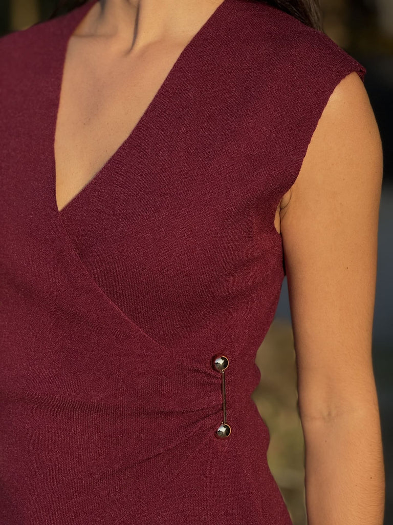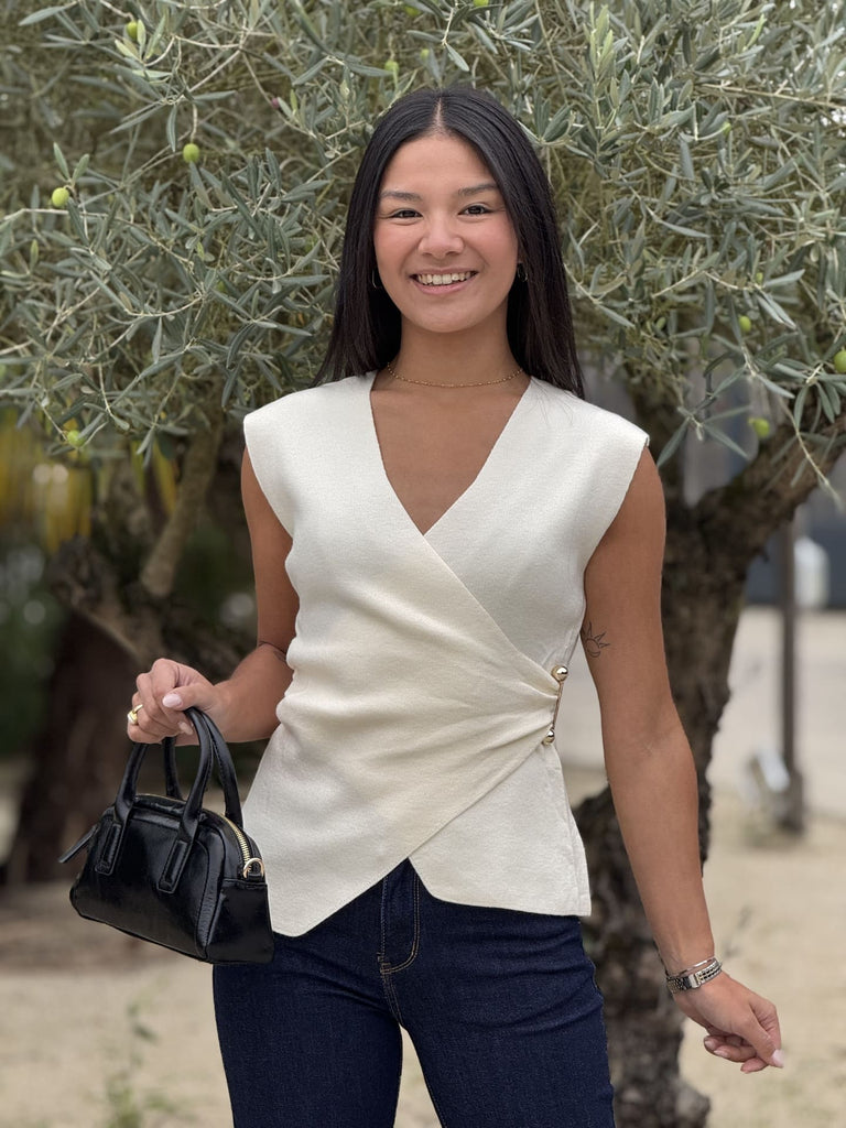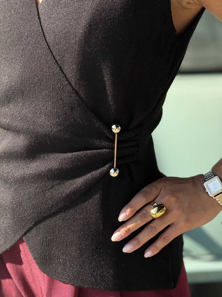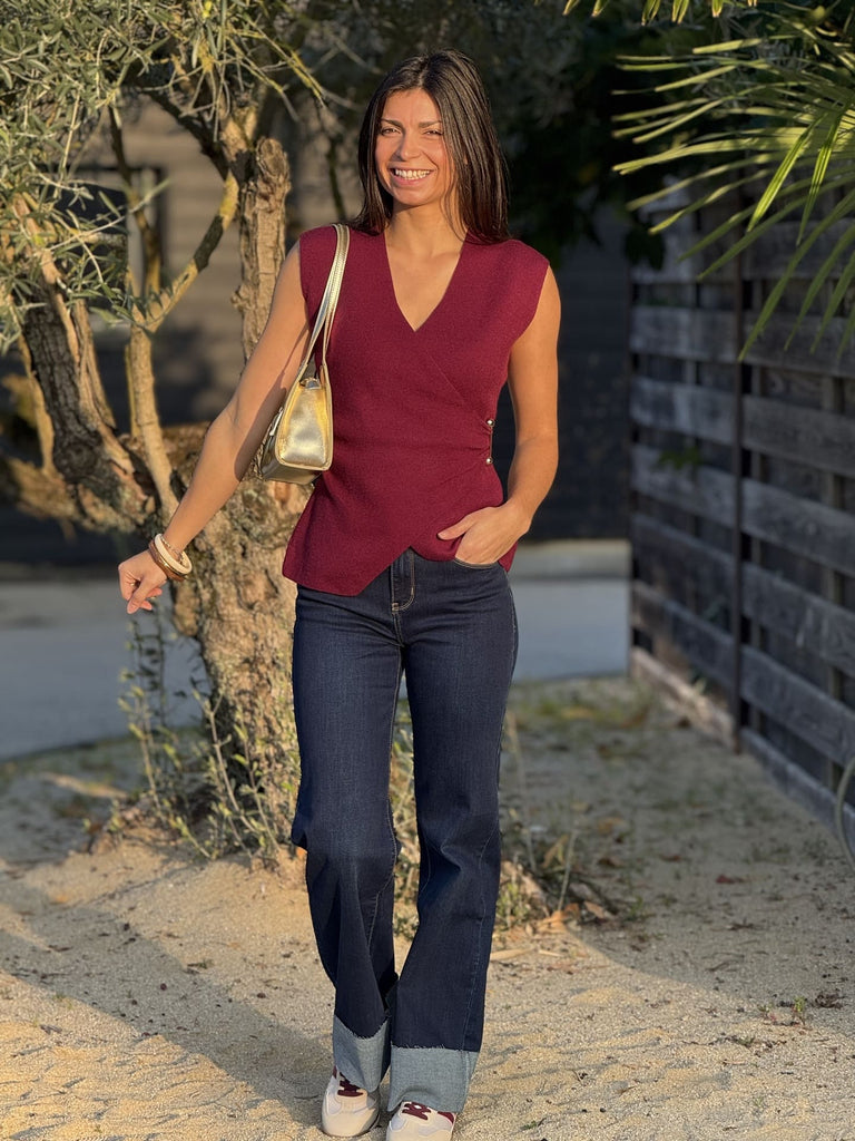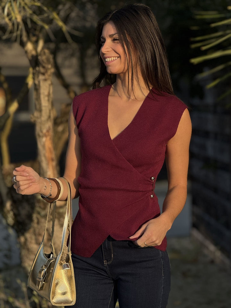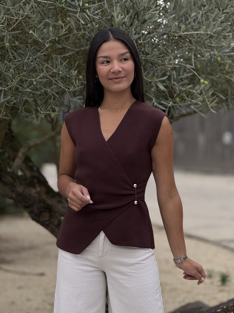 • GILET SANS MANCHE COL CACHE CŒUR - FRONCE SUR COTE AVEC BROCHE DORE