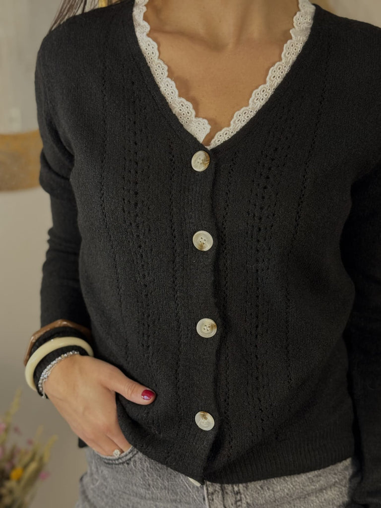• Gilet à ml ajouré avec dentelle sur le cols